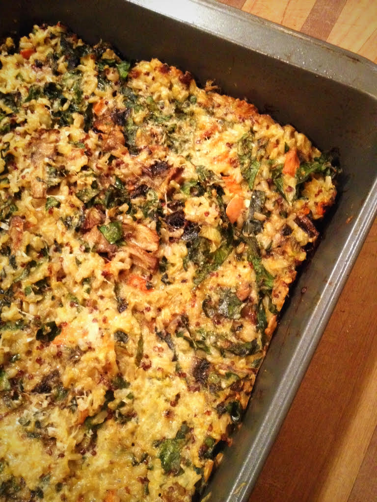 Preheat the oven to 180 degrees. Cook the rice and quinoa according to packet directions. Cool. In a large pan, heat the oil and gently cook the onion, garlic and carrot until soft but not too brown. Stir the vegetable mixture through the cooled rice along with the rest of the ingredients.