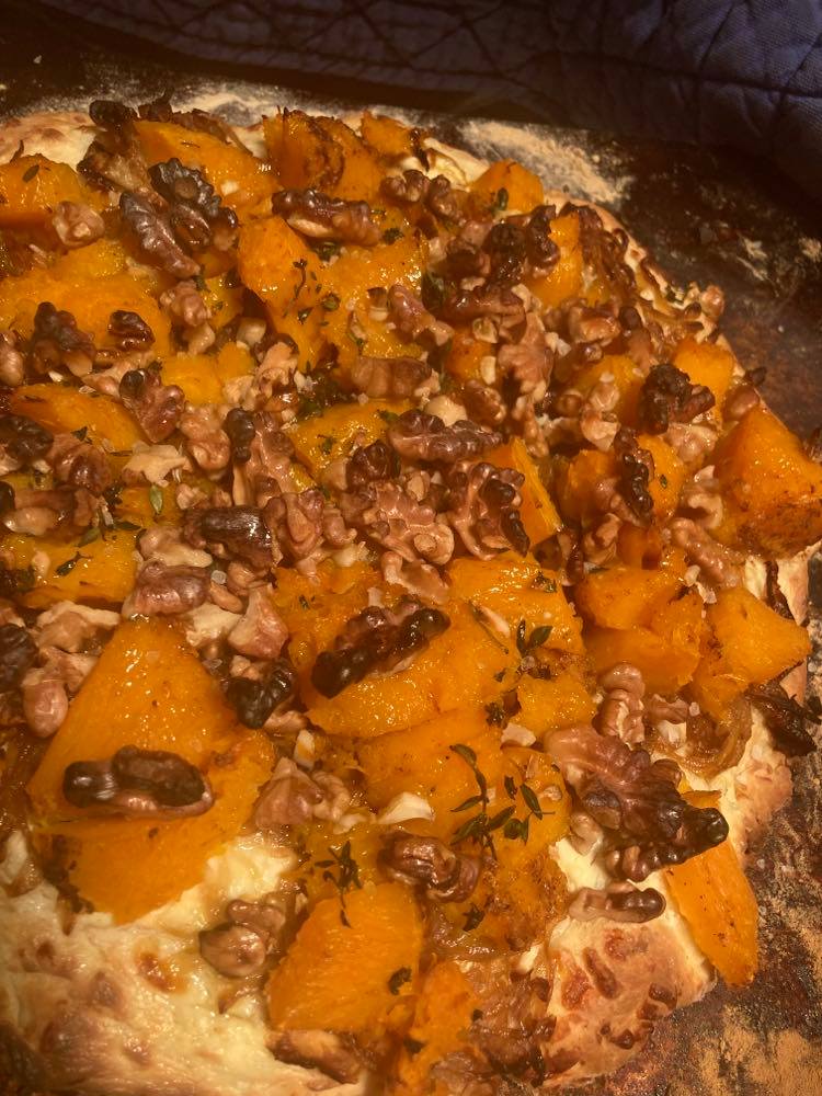 Once the butternut is cool enough to handle, peel the skin off, discard the seeds, and chop the flesh into 2cm chunks. To assemble, spread the cream cheese over the base. Next, sprinkle the onion, butternut, walnuts, chopped thyme and garlic. Drizzle with olive oil and season with salt and pepper.